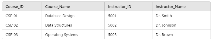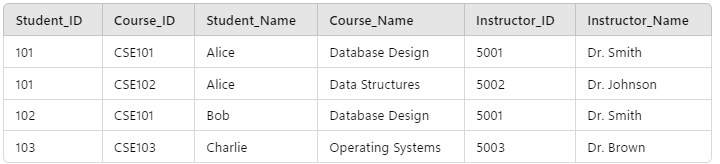 If the student associated with the enrollment changed (i.e. the Student_ID for the enrollment was modified), the Student_Name column would also potentially update (assuming the new student had a different name), but the Course_Name would be unaffected. Conversely, the Course_Name, Instructor_ID and Instructor_Name all depend on the Course_ID but not the Student_ID.