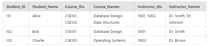 Student_ID and Course_ID together) and the arrays have been broken out into individual rows.What’s interesting to note is that in the process of ensuring the table is in 1NF, we’ve inadvertently made an ontological statement: the concept we’re representing is an “Enrollment” (even if we haven’t explicitly named it as such yet), i.e. each combination of a student and course.