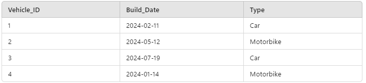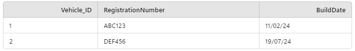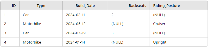 Lastly, you may have noticed that in this instance, because we only have one property on Vehicles not already described by the Cars and Motorbikes tables (Build_Date), we have the option of having a Build_Date property on both Cars and Motorbikes and removing the Vehicles table entirely. Our decision to do so would depend on how many common properties of the Cars and Motorbikes we have and whether or not there are downstream benefits to having both sets of vehicles in the same table. For example, if we often want to do things like view the number of all vehicles built per month, retaining a single Vehicles table might be useful.